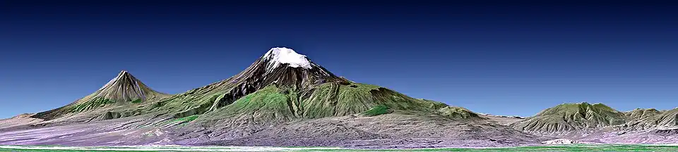O pico menor (de 3 896 m, Baixo Ararate) levanta-se da mesma base, a sudeste do pico principal. O planalto de lava se espalha entre os dois pináculos. As bases dessas duas montanhas é de aproximadamente 1 000 km².[carece de fontes?]
