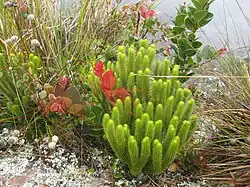 Vegetação do planalto: Cyrilla racemiflora (folhas vermelhas) e uma Huperzia ("tufos" verdes). |