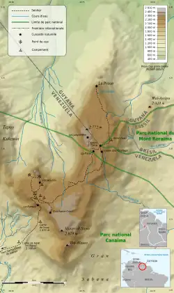 Na Venezuela, o maciço do monte Roraima está inserido no Parque Nacional Canaíma, uma das maiores áreas de conservação da América Latina com mais de três milhões de hectares de extensão. No parque, que é declarado patrimônio da humanidade pela UNESCO, o monte Roraima é só mais um dos vários tepuis, montanhas em formato de mesa.[22]