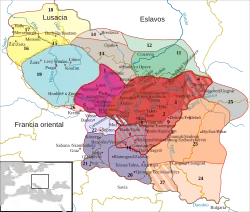 - Zona Ocidental: nas mãos da Frância Oriental (Alemanha), mais tarde Sacro Império Romano-Germânico, onde foi formada uma série de marquesados para conter a ameaça húngara. Estes marquesados incluíam: Marca da Morávia, Marca da Áustria, Marca da Estíria, Marca da Caríntia, Marca da Carniola e Marca da Ístria. O Ducado da Boémia também foi fundado nesta área.