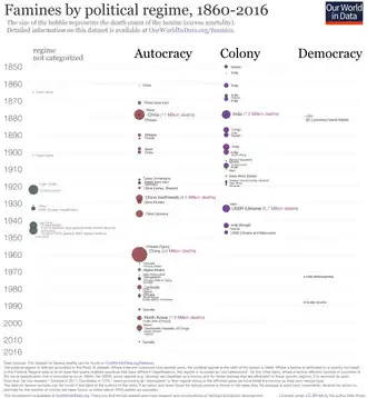 - Em 1994, o polemizado livro Death by Government do autor e academico Rudolph Joseph Rummel incluiu cerca de 110 milhões de pessoas, estrangeiras e não-estrangeiras, mortas pelo democídio comunista de 1900 a 1987.[48] Este total excluiu as mortes da Grande Fome Chinesa de 1958-1961 devido à crença do Autor de que "embora as políticas de Mao fossem responsáveis pela fome, ele foi enganado sobre isso e, finalmente, quando descobriu, parou e mudou suas políticas."[49][50] Rummel mais tarde revisaria sua estimativa de 110 milhões para cerca de 148 milhões[51] devido a informações adicionais sobre a culpa de Mao na Grande Fome Chinesa de Mao: A História Desconhecida, incluindo a pesquisa de Jon Halliday e Jung Chang das estimativas de 38 milhões de mortes pela fome.[52][53]
