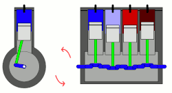 Animação de um motor de quatro cilindros em linha e 4 tempos.