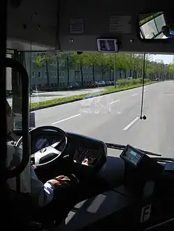 Posto de condução de um motorista de pesados de passageiros, dos transportes urbanos de Munique.