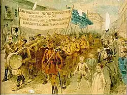 "Por que não está no exército?" Poster de recrutamento do Exército de Voluntários durante a Guerra Civil Russa. O exército de voluntários existiu de 1918 até 1920. A 1ª Divisão deste exército foi comandada por Anton Denikin.