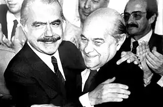 O presidente-eleito, Tancredo Neves, comemora o resultado da eleição junto a seu vice, José Sarney.