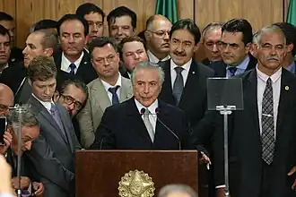 Michel Temer assumiu a presidência interinamente em 12 de maio de 2016. Temer contou com diversos partidos, tanto apoiadores do Governo Dilma quanto oposicionistas para compor o seu gabinete, dentre eles: PSDB, DEM, PP, PR, PSB, PSD, PPS, PTB, PRB e PV, compondo uma ampla base parlamentar — mesmo que fragmentada.[54] Seu principal objetivo é implementar reformas de caráter liberal, como a PEC 55, que limita gastos públicos, a Reforma da Previdência, a Reforma Trabalhista e a Reforma do Ensino Médio.