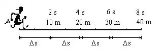 Observe o exemplo que o rapaz percorre espaços iguais em tempos iguais. Ele leva 2 s para percorrer cada 10 m, ou seja, quando está a 10 m se passaram 2 s, quando está em 20 m se passaram 4 s e assim sucessivamente, de tal forma que se calcularmos sua velocidade em cada uma das posições descritas (em relação a posição inicial, que neste caso é zero), teremos: