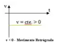 Por convenção, definimos:Movimento progressivo: quando um corpo se desloca em um sentido que coincide com a orientação da trajetória, ou seja, para frente, então ele terá uma v>0 e Δs>0.Movimento retrógrado: quando o sentido do movimento for contrário ao sentido de orientação da trajetória, ou seja, para trás, então ele terá uma v<0 e Δs<0.