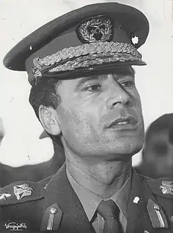 Muammar Muhammad Abu Minyar al-Gaddafi[a] (Abu Hadi, c.1942  Sirte, 20 de outubro de 2011), vulgarmente conhecido como Coronel Gaddafi, foi um revolucionário líbio, político e teórico político. Governou a Líbia como Presidente Revolucionário da República Árabe Líbia de 1969 a 1977 e depois como "Líder Fraternal" da Grande Jamahiriya Árabe Popular Socialista da Líbia de 1977 a 2011. Inicialmente estava ideologicamente empenhado no nacionalismo árabe e no socialismo árabe, mas mais tarde governou conforme a sua própria Terceira Teoria Internacional.