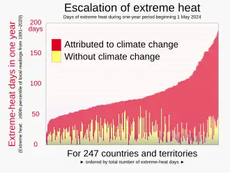 A mudança climática contemporânea inclui tanto o aquecimento global – o aumento contínuo da temperatura média global – quanto os seus efeitos mais amplos no sistema climático da Terra. A mudança climática em um sentido mais amplo também inclui alterações de longo prazo anteriores no clima da Terra. A atual elevação das temperaturas globais é impulsionada por atividades humanas, especialmente a queima de combustíveis fósseis (carvão, óleo e gás natural) desde a Revolução Industrial.[3][4] O uso de combustíveis fósseis, o desmatamento e algumas práticas agrícolas e industriais liberam gases do efeito estufa.[5] Esses gases absorvem parte do calor que a Terra irradia após ser aquecida pela luz solar, aquecendo a baixa atmosfera. A atmosfera da Terra tem agora aproximadamente 50% mais dióxido de carbono, o principal gás que impulsiona o aquecimento global, do que tinha no final da era pré-industrial, atingindo níveis não vistos em milhões de anos.[6] As mudanças climáticas têm um impacto no meio ambiente cada vez maior. Os desertos estão se expandindo, enquanto as ondas de calor e os incêndios florestais estão se tornando mais comuns.[7] O aquecimento amplificado no Ártico tem contribuído para o descongelamento do permafrost, o recuo das geleiras e o declínio do gelo marinho.[8] Temperaturas mais altas também estão causando tempestades mais intensas, secas e outros extremos climáticos.[9] A rápida mudança ambiental em montanhas, recifes de corais e no Ártico está forçando muitas espécies a se realocarem ou a serem levadas à extinção.[10] Mesmo que os esforços para minimizar o aquecimento futuro sejam bem-sucedidos, alguns efeitos continuarão por séculos. Estes incluem o aquecimento dos oceanos, a acidificação oceânica e a elevação do nível do mar.[11]