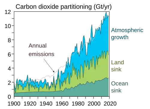 Embora o metano dure na atmosfera em média apenas 12 anos,[125] o CO₂ dura muito mais tempo. A superfície da Terra absorve CO₂ como parte do ciclo do carbono. Enquanto as plantas terrestres e oceânicas absorvem a maior parte das emissões excedentes de CO₂ todos os anos, esse CO₂ retorna à atmosfera quando a matéria biológica é digerida, queimada ou entra em decomposição.[126] Processos terrestres de sumidouro de carbono, como a fixação de carbono no solo e a fotossíntese, removem cerca de 29% das emissões globais anuais de CO₂.[127] O oceano absorveu de 20 a 30% do CO₂ emitido ao longo das duas últimas décadas.[128] O CO₂ só é removido da atmosfera a longo prazo quando é armazenado na crosta terrestre, processo que pode levar milhões de anos para ser concluído.[126]