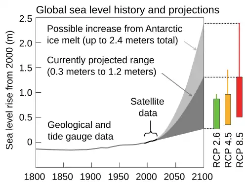 O nível médio do mar em escala global está subindo como consequência da expansão térmica e do derretimento de geleiras e de mantos de gelo. A elevação do nível do mar acelerou com o passar do tempo, atingindo 4,8 cm por década entre 2014 e 2023.[205] Ao longo do século XXI, o IPCC projeta de 32 a 62 cm de aumento do nível do mar sob um cenário de baixas emissões, de 44 a 76 cm sob um cenário intermediário e de 65 a 101 cm sob um cenário de emissões muito altas.[206] Processos de instabilidade do manto de gelo marinho na Antártida podem adicionar contingentes substanciais a esses valores,[207] incluindo a possibilidade de um aumento de 2 metros no nível do mar até 2100 em um cenário de altas emissões.[208]