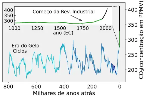 Antes da Revolução Industrial, as quantidades naturais de gases de efeito estufa faziam com que o ar próximo à superfície fosse cerca de 33 °C mais quente do que seria na ausência deles.[109][110] A atividade humana desde a Revolução Industrial, principalmente a extração e queima de combustíveis fósseis (carvão, óleo e gás natural),[111] aumentou a quantidade de gases de efeito estufa na atmosfera. Em 2022, as concentrações de CO₂ e metano haviam aumentado em cerca de 50% e 164%, respectivamente, desde 1750.[112] Estes níveis de CO₂ são mais elevados do que em qualquer momento durante os últimos 14 milhões de anos.[113] As concentrações de metano são muito mais altas do que foram ao longo dos últimos 800.000 anos.[114]
