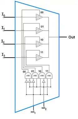 | As figuras acima mostram esquemas eléctricos de multiplexadores de 4 para 1 linhas, uma montada a partir de um decodificador, portas AND e uma porta OR, e o outro montado a partir de buffers tristate e portas AND (a portas AND atuam como o decodificador no segundo caso) | |