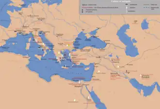 Esse processo foi auxiliado pela adoção universal do grego como língua da cultura intelectual e do comércio no Mediterrâneo Oriental e do latim como língua da administração pública e da defesa forense, especialmente no Mediterrâneo Ocidental.[1][2]