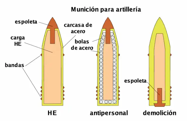 Antipessoal: com carga explosiva e preenchida com metralhas de aço. Usada contra formações de infantaria.