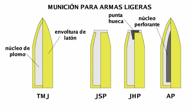 TMJ (Total metal jacket ou Full Metal Jacket - projétil "encamisado" com latão e núcleo de chumbo).[5]