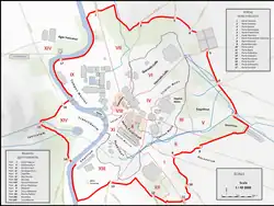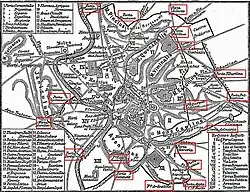 ![]() Mapa da Roma antiga mostrando a Muralha e seus portões destacados. | |