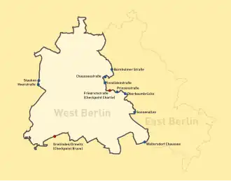 Havia nove travessias de fronteira entre Berlim Oriental e Ocidental. Elas permitiam visitas de berlinenses ocidentais, outros alemães ocidentais, estrangeiros ocidentais e pessoal aliado a Berlim Oriental, bem como visitas de cidadãos da RDA e cidadãos de outros países socialistas a Berlim Ocidental, desde que tivessem as autorizações necessárias. Essas travessias eram restringidas de acordo com a nacionalidade autorizada a utilizá-las (alemães orientais, alemães ocidentais, berlinenses ocidentais e outros países). O mais conhecido era o posto de controle de veículos e pedestres na esquina da Friedrichstraße com a Zimmerstraße (Checkpoint Charlie), que era restrito a pessoal aliado e estrangeiros.[56]
