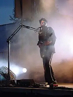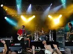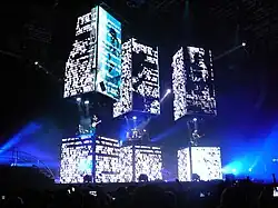 ![]() Muse no Estádio Ashton Gate, em Bristol. Da esquerda para a direita: Matthew Bellamy, Christopher Wolstenholme e Dominic Howard. | |