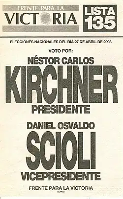 Carlos Menem concorreu para um novo mandato como presidente em 2003, e Duhalde tentou evitar que isso ocorresse. Em vez de realizar eleições primárias dentro do PJ, as eleições de 2003 usaram uma variante da Ley de Lemas.[32] Todos os candidatos peronistas foram autorizados a concorrer nas eleições gerais, usando suas próprias chapas. Embora Kirchner tenha concorrido à presidência com o apoio de Duhalde, ele não foi a primeira escolha do presidente. Tentando impedir um terceiro termo para Menem, Duhalde se aproximou do governador de Santa Fé, Carlos Reutemann, e do governador de Córdoba, José Manuel de la Sota; Reutemann declinou, e de la Sota não concorreu por não ser suficientemente popular. Duhalde também se aproximou sem sucesso de Mauricio Macri, Adolfo Rodríguez Saá, Felipe Solá e Roberto Lavagna, todos os quais se recusaram a concorrer. Duhalde inicialmente resistiu a apoiar Kirchner, temendo que ele o ignorasse se fosse eleito.[33] Kirchner concorreu como candidato da Frente para a Vitória, uma das várias frentes apresentadas pelo PJ. Uma vez que Kirchner foi identificado com a centro-esquerda, Duhalde nomeou Daniel Scioli, da centro-direita, como candidato a vice-presidente.[34] Apenas um punhado de governadores peronistas apoiaram algum candidato; a maioria permaneceu neutra, aguardando a eleição para forjar um relacionamento com o vencedor.[35]