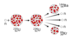 Os reatores de fissão[12] são uma das fontes de nêutrons mais intensas. Assim como a fissão podem existem reatores de diferentes elementos. Um exemplo clássico é o da fissão do urânio-235. Durante operação de um reator de urânio-235 ocorre um aumento da quantidade de elementos menores como, por exemplo, bário-144 e criptônio-89, devido ao decaimento do urânio-235 em elementos mais leves.