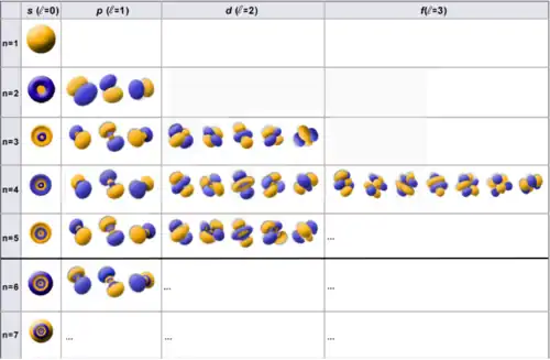 - l = 2 : corresponde ao subnível d onde existem cinco orientações permitidas, ou seja, cinco valores de ml (-2, -1, 0, +1, +2). São designados por dz² (orientação coincidente com o eixo z), dx²-y² (orientação coincidente com os eixos x e y, simultaneamente), dxy (orientado entre os eixos x e y), dyz (orientado entre os eixos y e z) e dxz (orientado entre os eixos x e z).