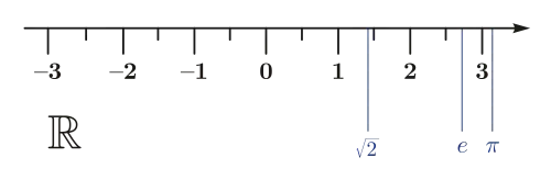 - Números reais podem ser usados para expressar medições de quantidades contínuas.[5] Eles podem ser expressos por representações decimais, a maioria delas com uma sequência infinita de dígitos à direita do ponto decimal; estes são frequentemente representados como 34,823122147..., onde as reticências indicam que ainda haveria mais dígitos por vir. Isso sugere o fato de que é possível denotar precisamente apenas alguns números reais selecionados com uma quantidade finita de símbolos.