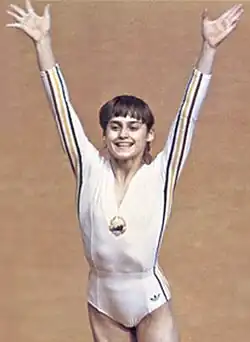 Nadia Elena Comăneci (Onești,[1] 12 de novembro de 1961) é uma ex-ginasta romena, que disputou a modalidade artística e é ainda hoje tida como um ídolo mundial esportivo.