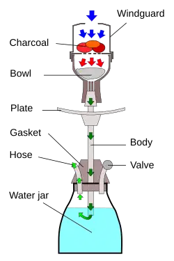 Quando se aspira o ar pela mangueira, reduz-se a pressão no interior da base: isso faz com que ar aquecido pelo carvão passe pelo tabaco (essência), produzindo a fumaça. Ela desce pelo corpo até a base e passa pela água, onde é resfriada e filtrada, retendo-se as partículas sólidas. A fumaça segue pela mangueira até ser aspirada pelo usuário e expirada logo em seguida.