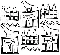 Selo de recipiente em barro, indicando que o conteúdo provém do espólio do faraó Narmer. Originalmente de Tarcã, agora em exibição no Museu Metropolitano de Arte, Nova Iorque.[32]