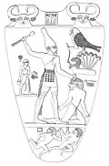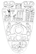 - ↑ Quibell, J. E. (1898). «Slate Palette from Hierakonpolis». Zeitschrift für ägyptische Sprache und Altertumskunde (36): 81–84, pl. XII–XIII. doi:10.1524/zaes.1898.36.jg.81