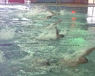 Disputam-se também provas de estafetas, em que quatro nadadores se revezam a nadar.