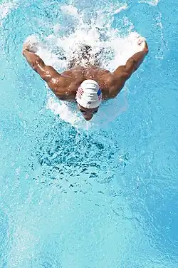 - No estilo mariposa, o atleta também fica com o peito voltado para o fundo da piscina, mas joga os dois braços ao mesmo tempo para frente por cima da água e produz um movimento também sincronizado com as pernas, para cima e para baixo, similar ao movimento da cauda de um golfinho.