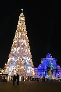 A árvore de Natal foi usada pela primeira vez pelos luteranos alemães no século XVI, com registros indicando que uma árvore de Natal foi colocada na Catedral de Estrasburgo em 1539, sob a liderança do reformador protestante Martin Bucer.[127][128] Nos Estados Unidos, esses "luteranos alemães trouxeram a árvore de Natal decorada consigo; os morávios colocaram velas acesas nessas árvores".[129][130] Ao decorar a árvore de Natal, muitas pessoas colocam uma estrela no topo da árvore, simbolizando a Estrela de Belém, um fato registrado pelo The School Journal em 1897.[131][132] O professor David Albert Jones, da Universidade de Oxford, escreve que, no século XIX, tornou-se popular usar também um anjo no topo da árvore de Natal para simbolizar os anjos mencionados nos relatos do nascimento de Jesus.[133] Além disso, a árvore de Natal, sendo de cor perene, é simbólica de Cristo, que oferece a vida eterna; as velas ou luzes na árvore representam a Luz do Mundo — Jesus — nascido em Belém.[134][135] Serviços cristãos para uso familiar e culto público foram publicados para a bênção de uma árvore de Natal, após ela ter sido erguida.[136][137] A árvore de Natal é considerada por alguns como cristianização da tradição e ritual pagãos em torno do Solstício de Inverno, que incluía o uso de ramos perenes e uma adaptação do culto pagão às árvores.[138] De acordo com o biógrafo do século VIII , Æddi Stephanus, São Bonifácio (634–709), que era missionário na Alemanha, pegou um machado e cortou um carvalho dedicado a Thor, apontando para um abeto, que ele afirmou ser um objeto de reverência mais apropriado porque apontava para o céu e tinha uma forma triangular, que ele disse ser simbólica da Trindade.[139] The English language phrase "Christmas tree" is first recorded in 1835[140]