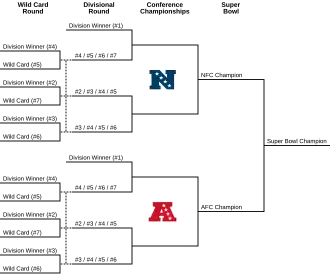 Após os times da AFL serem absorvidos pela NFL em 1970, a liga se dividiu em duas conferências fixas, com três divisões cada. A liga expandida, agora com vinte e seis equipes,[24] também expandiu sua pós-temporada, aceitando oito times, sendo os três campeões de divisão de cada conferência e um time de repescagem (wild card), que era o time de melhor campanha sem ser um campeão de divisão, de cada conferência. Em 1978, a NFL adicionou um segundo time de repescagem por conferência, elevando para dez o número de equipes que se classificavam por ano para os playoffs, e mais dois times de repescagem foram adicionados em 1990, trazendo o número de classificados para doze, tudo isso para acomodar mais times que eram aceitos na liga. Em 2002, a NFL passou a ter 32 times, levando a um realinhamento de sua tabela, mudando a estrutura das divisões (que agora passaram a ser quatro em cada conferência). Com cada campeão de divisão se classificando, o número de times de repescagem que se classificavam para a pós-temporada se reduziu de três para dois (por conferência).[35] Contudo, os playoffs foram expandidos novamente em 2020, adicionando mais dois times que se classificavam na repescagem, levando a um total de quatorze equipes que poderiam disputar a pós-temporada.[36]