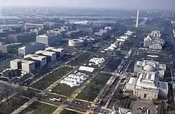 ![]() O National Mall durante os preparativos para a cerimônia de posse de Bill Clinton, 1993. | |