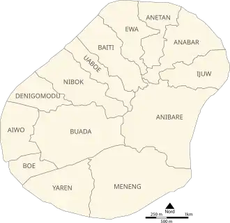 Com área de 21 quilômetros quadrados, bem como 30 quilômetros de zona costeira. Seu ponto mais baixo é o oceano Pacífico que está a 0 metros e o mais alto é Janor com 70 metros. Segundo censo de 2018, tinha 9 692 habitantes, 88,9% nauruanos, 6,6% nauruanos mestiços, 2% quiribatianos e os demais 2,5% não especificados. Segundo estimativas de 2011, se fala 93% o nauruanês, 2% o inglês e os demais 5% incluem quiribati e chinês.[16]