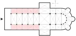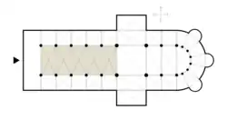 Representação esquemática de uma planta de catedral. A nave é a área colorida.Representação esquemática de uma planta de catedral. As colaterais (ou naves laterais) são as áreas coloridas.
