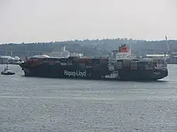 Um navio cargueiro em Elliot Bay, Seattle, Washington