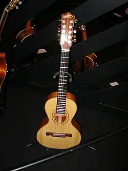 Violão: possui corda de nylon ou aço, concebida inicialmente para a interpretação de peças de música erudita. O corpo é oco e chato, em forma de oito, e feito de várias madeiras diferentes. O braço possui trastes que a tornam um instrumento temperado. As versões mais comuns possuem seis cordas de nylon, mas há violões com outras configurações, como o violão de sete cordas e o violão baixo, com 4 cordas, afinadas uma oitava abaixo das 4 cordas mais graves do violão.[215]