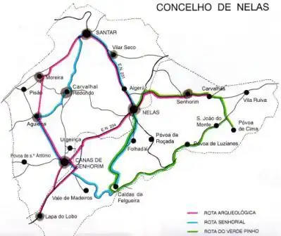 - (1) Rota Arqueológica: começando por Nelas, Canas de Senhorim, Lapa do Lobo, Aguieira, Moreira, Santar, Vilar Seco, Senhorim e Carvalhas.