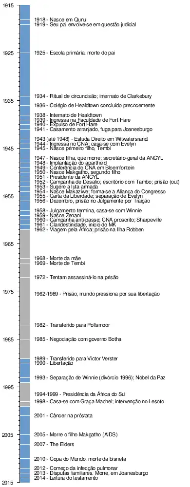 Nascido numa família de nobreza tribal, numa pequena aldeia do interior onde possivelmente viria a ocupar cargo de chefia, recusou esse destino aos 23 anos ao seguir para a capital, Joanesburgo, e iniciar sua atuação política.[3] Passando do interior rural para uma vida rebelde na faculdade, transformou-se em um jovem advogado na capital e líder da resistência não violenta da juventude, acabando como réu em um infame julgamento por traição. Foragido, tornou-se depois o prisioneiro mais famoso do mundo e, finalmente, o político mais galardoado em vida, responsável pela refundação do seu país como uma sociedade multiétnica.[4]