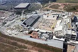 Em setembro, a obra atingiu 87% de conclusão, com o início da instalação das primeiras cadeiras na arquibancada inferior leste, a elevação das primeiras estruturas da cobertura e conclusão da demarcação oficial do campo.[66] Ao final de novembro, as obras estavam 95% concluídas quando um guindaste cedeu e acertou parte da arquibancada do estádio.[67]