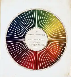 Com isso, Chevreul criou um círculo cromático com 72 cores e 5 zonas com 20 segmentos que retratam os efeitos de diferentes níveis de brilho.[3]
