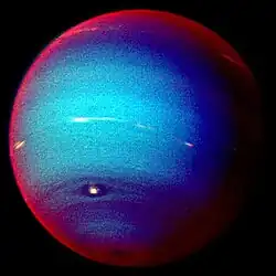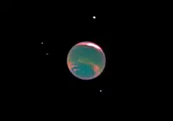 Combinação de observações no comprimento de onda visível e infravermelho próximo permitem identificar as bandas onde o gás metano é mais abundante (em azul) e a presença de nuvens que refletem o infravermelho (em vermelho). Os quatro pontos ao redor do planeta são os satélites naturais Proteu (o mais brilhante), Larissa, Galatea e Despina