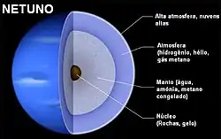 Netuno provavelmente possui um núcleo de material rochoso de massa similar à da Terra, cuja temperatura deve ser superior a 5 100 °C, possivelmente maior do que o núcleo de Urano.[24] Ao seu redor, existiria um grande "oceano", uma camada formada principalmente por oxigênio, nitrogênio, carbono e hidrogênio, mantidos sob grande pressão e temperatura. Contudo o termo não implica que exista necessariamente uma camada líquida no planeta, mas na verdade uma região onde estes elementos podem ser encontrados em átomos isolados ou formando substâncias químicas, principalmente água, metano e amônia. Não se sabe, contudo, a proporção desses elementos na constituição do planeta. Uma quantidade superior de hidrogênio poderia implicar sua manifestação com características metálicas, o que permitiria o fluxo de corrente elétrica e influenciaria o campo magnético.[25] Reações químicas podem ocorrer também entre os elementos químicos e substâncias, que teriam como produtos, por exemplo, hidrogênio molecular, que subiria para a atmosfera e diamante, que afundaria em direção ao núcleo.[23]