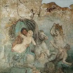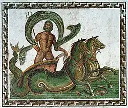 ![]() Um velificans de Netuno em sua carruagem triunfal puxada por cavalos-marinhos, de meados do século III d.C. - Museu Arqueológico de Sousse | |