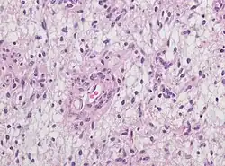 Fotomicrografia exibindo as células tumorais de glioma angiocêntrico por avaliação histológica, Coloração H&E.[16]