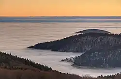 Nevoeiro durante o pôr do sol cobrindo o Vale de Savoureuse, França, visto a partir do Ballon d'Alsace.